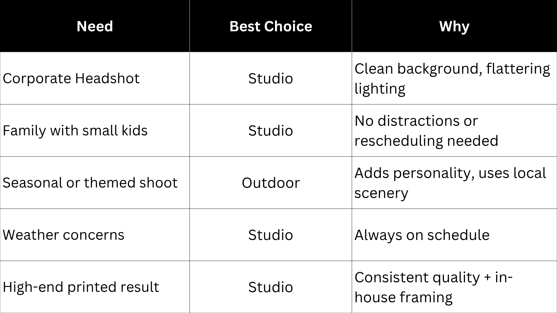 Both studio and outdoor photography have their place, but if you want reliable, timeless, and polished portraits, especially for professional or family use, a portrait photography studio is hard to beat. From lighting control to expert framing, the studio offers everything you need for results you’ll love for years.